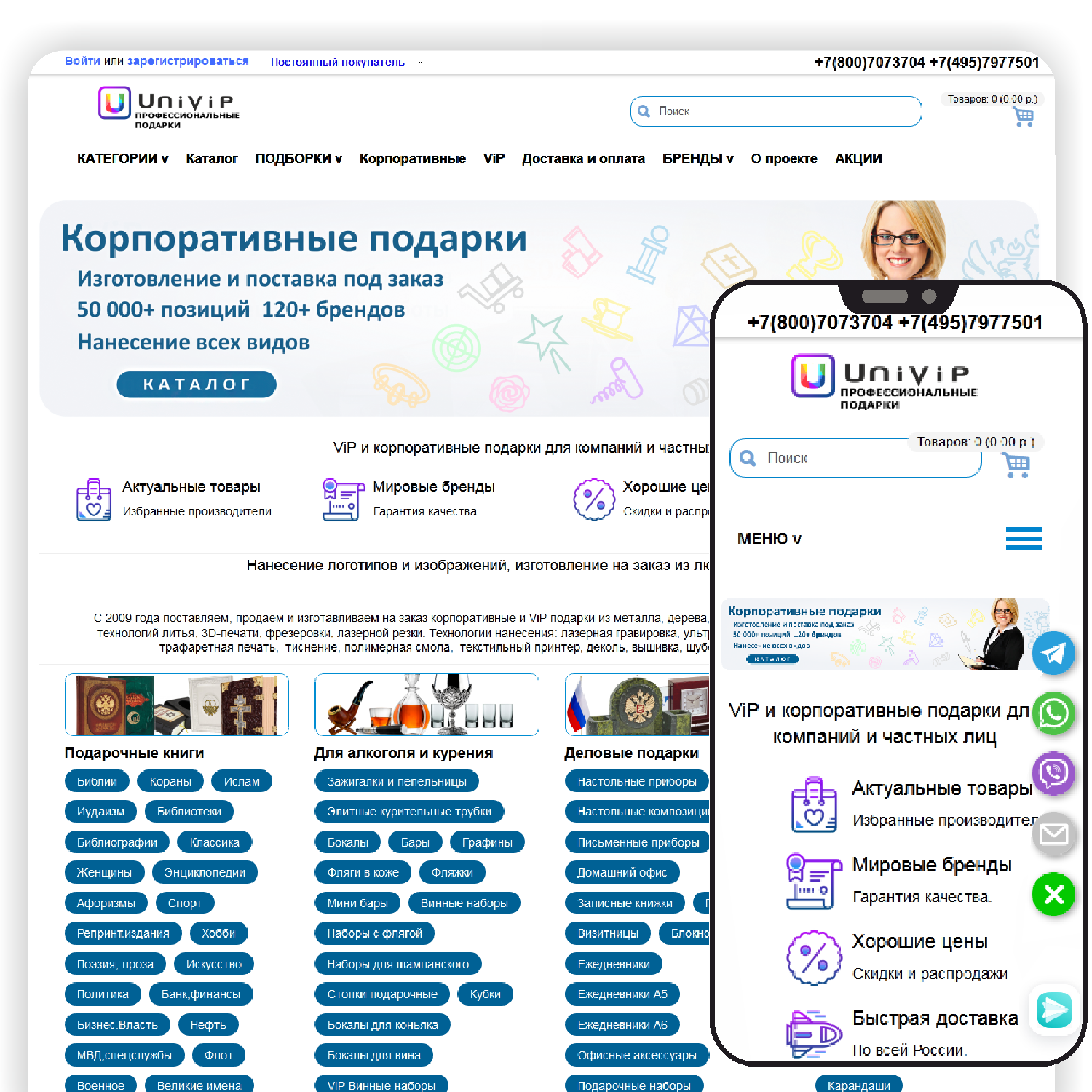 Univip.ru c 2010 года обеспечивает поставки сувенирной продукции, VIp-подарки и корпоративные подарки, и поэтому нам было важно показать все преимущества данной категории товара.