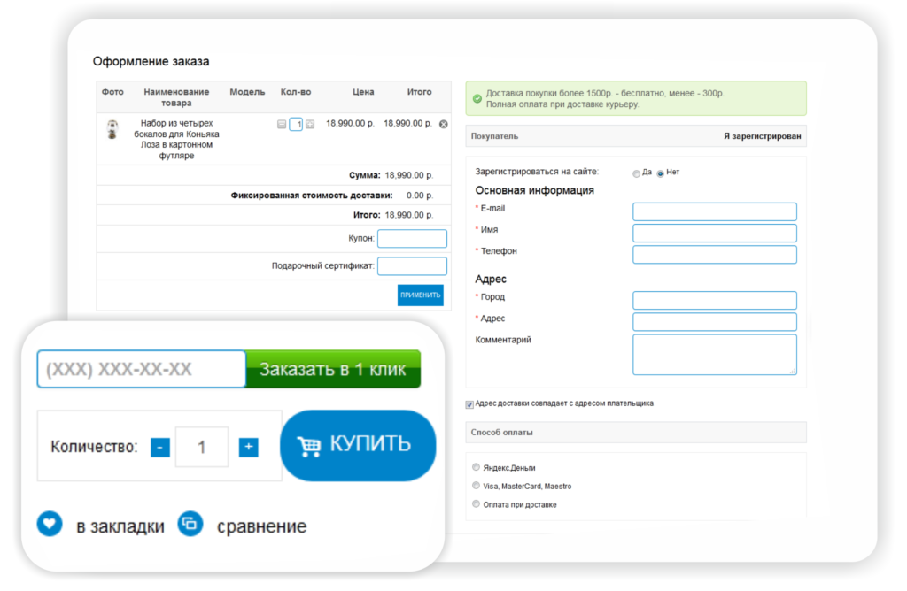 Быстрый заказ в интернет магазине также является одним из важнейших элементов конверсии. После добавления товара в корзину, и начала оформления потенциальный покупатель иногда отказывается от покупки столкнувшись со сложными шагами и большим количеством полей.